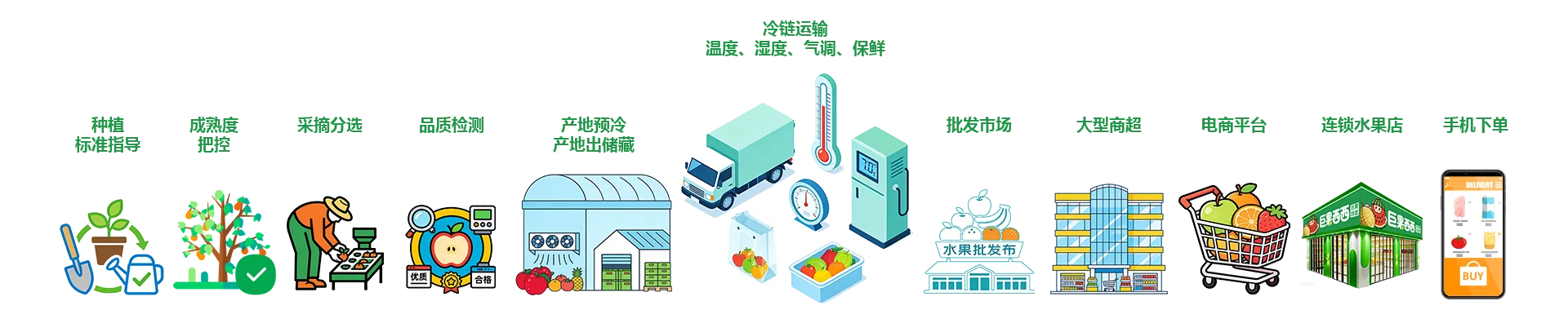 鲜果采收后直接进入产地加工中心,经预冷保鲜、分级分选等处理,通过 “国际专线+智能冷链” 直送全国终端门店,全程数字化监控温度、湿度等关键指标,确保鲜果从枝头到货架的鲜度稳定,将流通损耗降至最低。